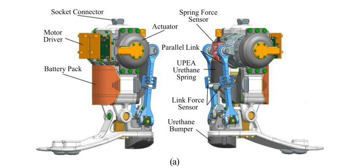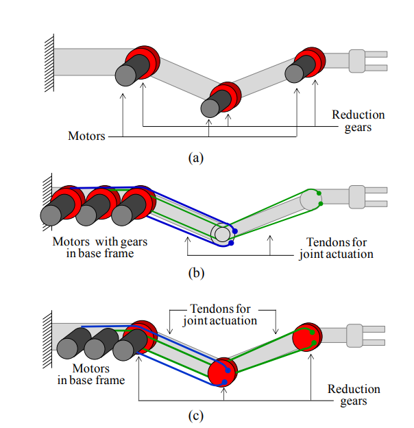 图(a) - 传统机械手:关节刚度高,但重量分布关节处转动惯量大。